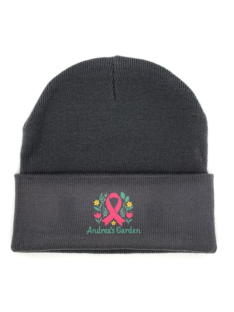 Charcoal cuffed winter knit hat with multicolored DTF transfer of Andrea's Garden design