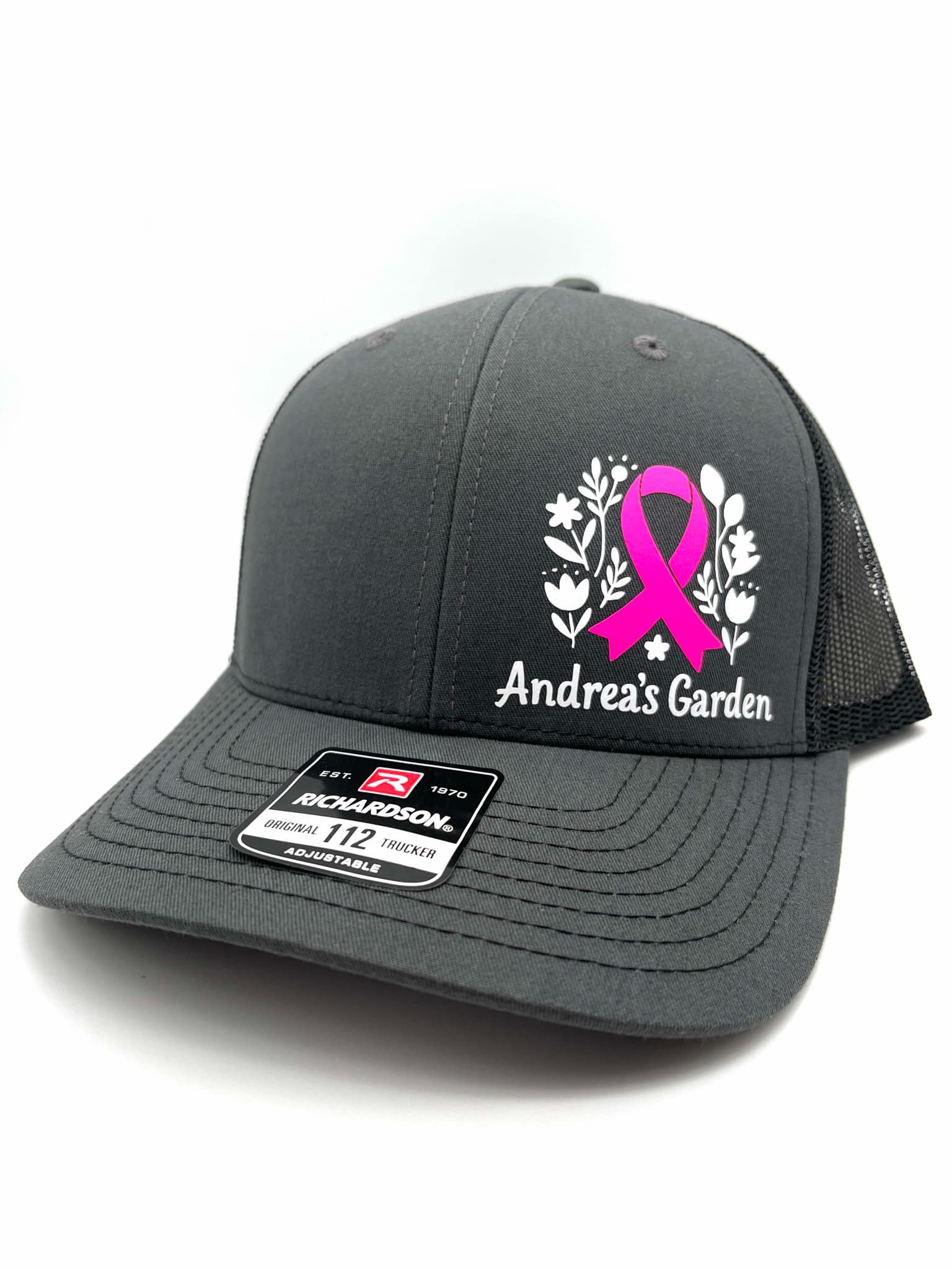 Richardson 112 Charcoal/Black mesh snapback adjustable hat with Andrea's Garden design in white and pink