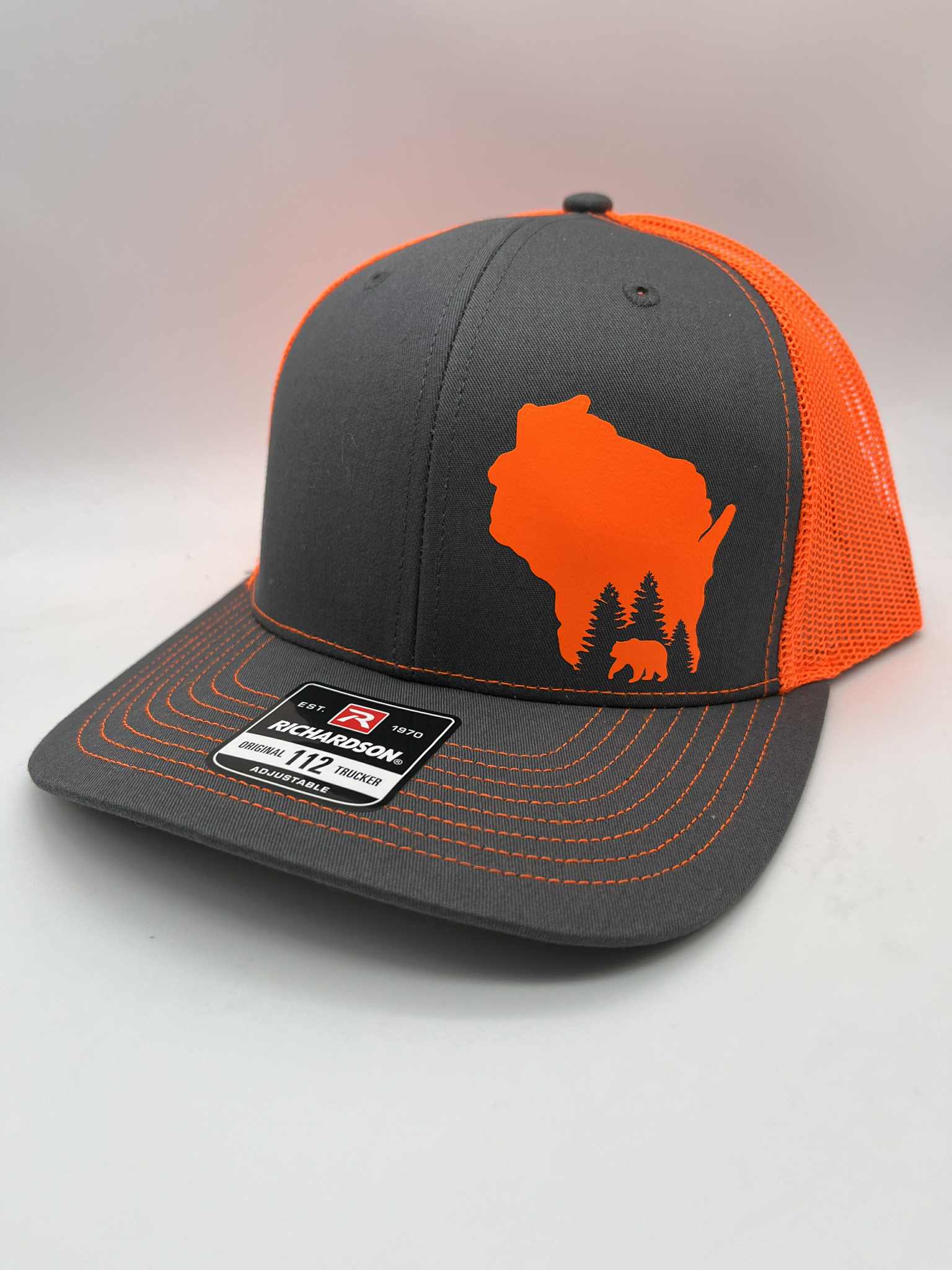 Richardson 112 or Flexfit 110 SnapBack hat with vinyl state of your choice and trees cut out with bear