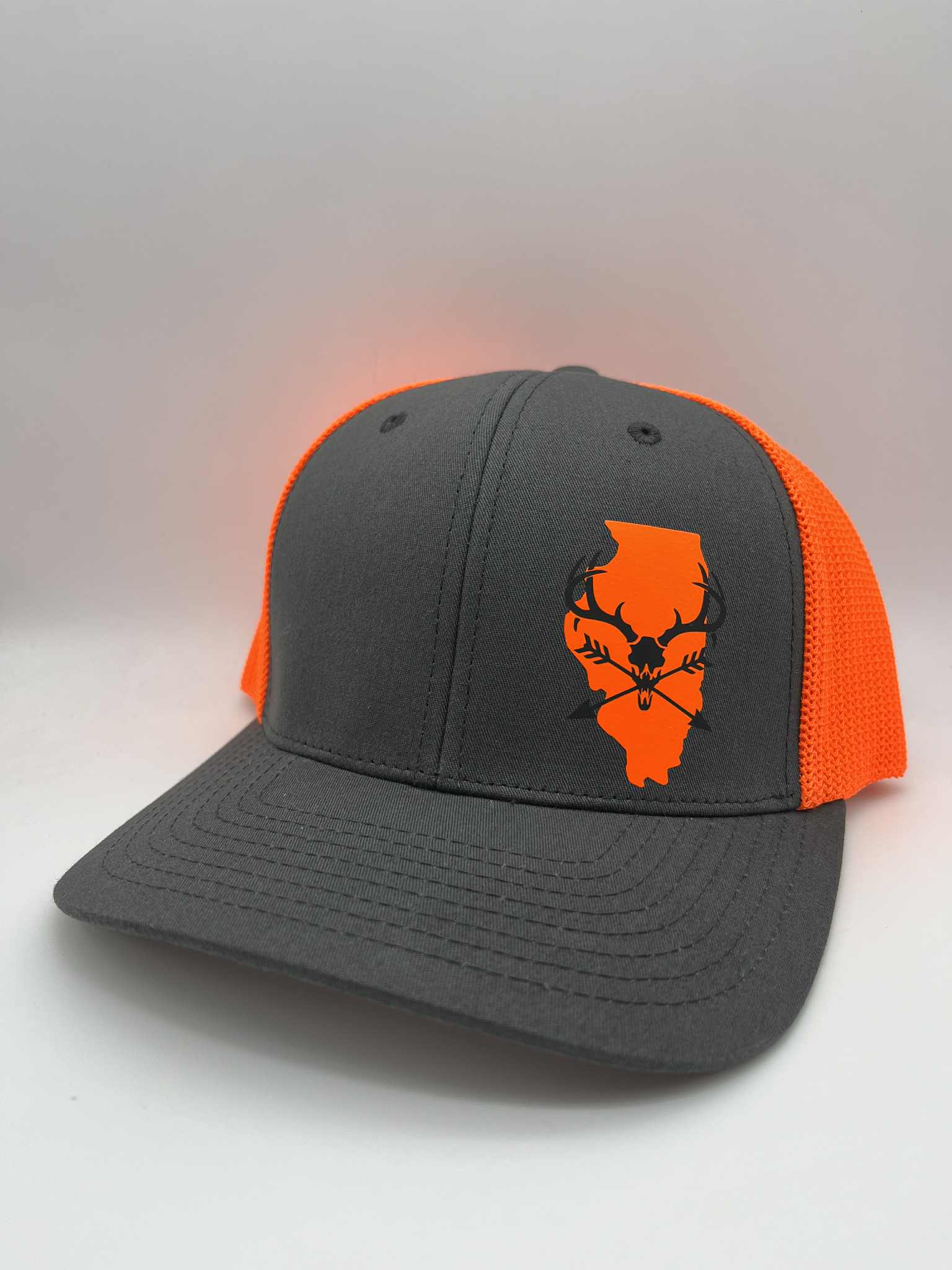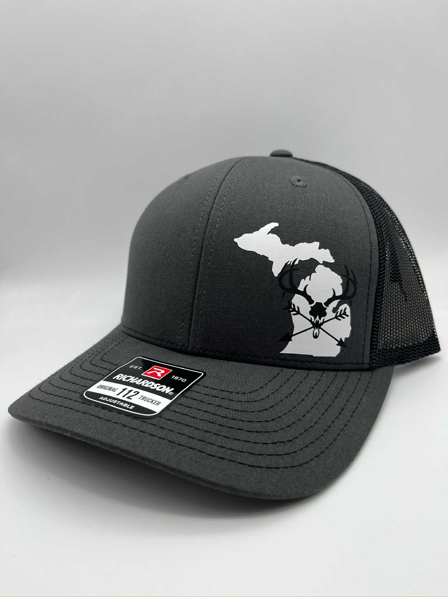 Flexfit 110 charcoal/black, dark gray/white, and light gray/white or Richardson 112 Dark Gray/Black with white vinyl decal of your state and black deer skull and arrows on top