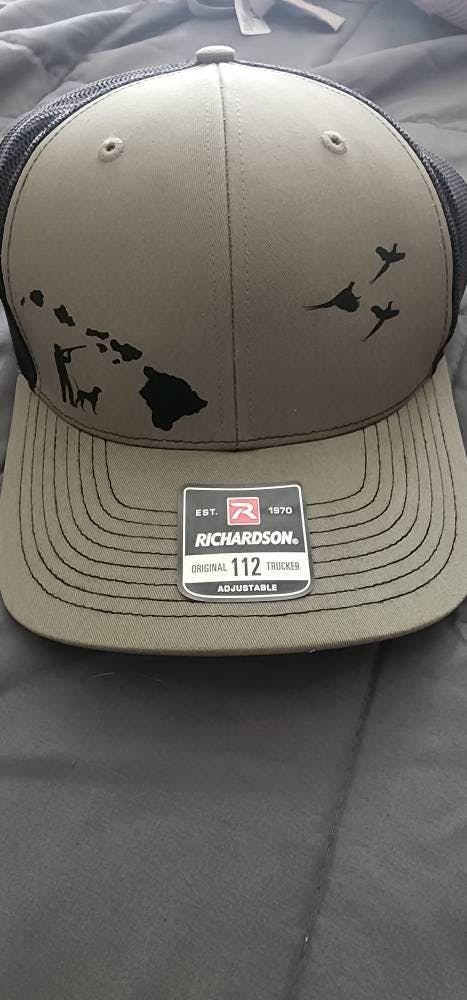 Richardson 112 charcoal/neon orange snap back hat with orange vinyl design or Richardson 112 charcoal/neon pink state with neon pink design of your state and hunter with dog on left and pheasants flying on right