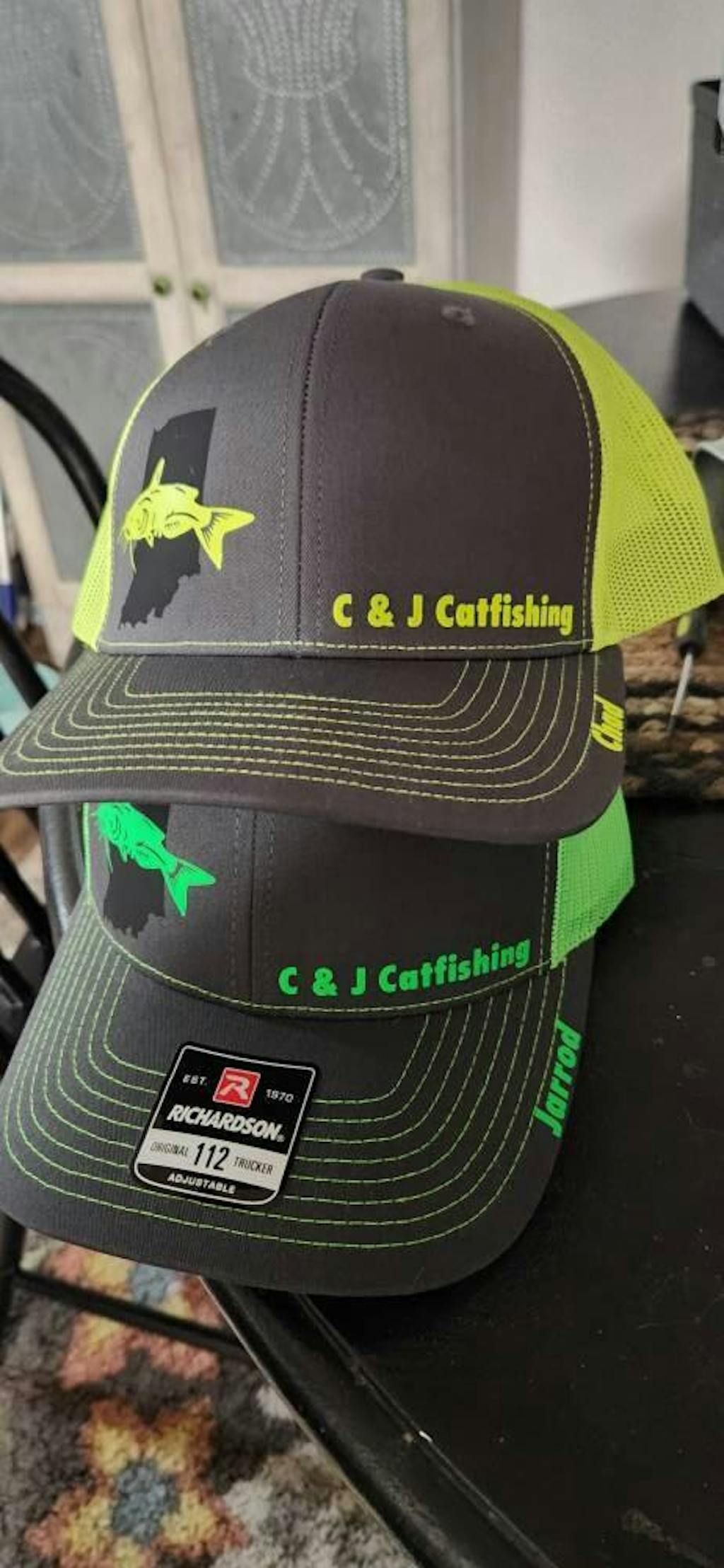 Catfish design with your color choice and either the state you want or a black silhouette behind it. Enter your state in the personalization section.