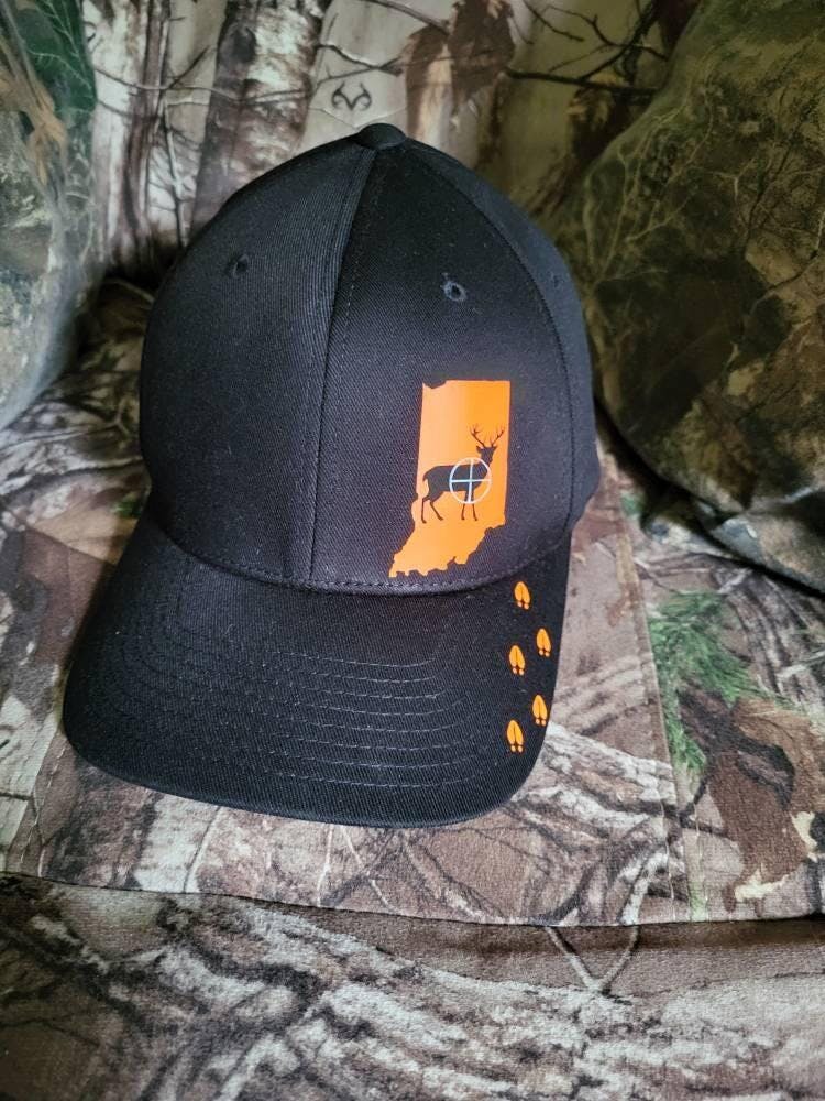 Flexfit all black cloth fitted hat with blaze orange or white vinyl state and deer and crosshairs